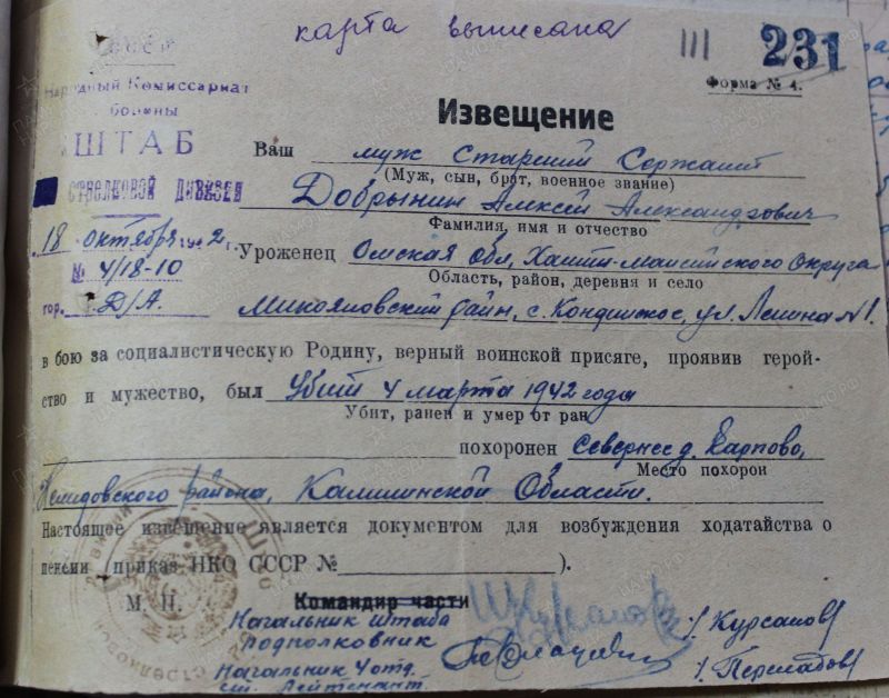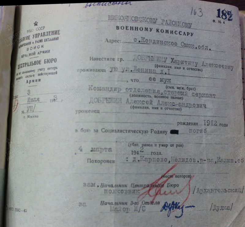 1210 стрелковый полк 362 стрелковой дивизии был сформирован в августе 1941 года в г. Омске на базе Омского пехотного училища и находился в резерве. Принял свой первый бой в районе г. Нелидов Калининской области в феврале 1942 года. Мой дед был командиром отделения. Их подразделению была поставлена боевая задача блокировать и уничтожить противника в деревне Карпово и наступать на ст. Мостовая. Немцы сильно укрепили этот район и регулярно высылали диверсионные группы в расположение наших позиций. 4 марта в бою у деревни Карпово мой дед старший сержант Добрынин Алексей Александрович погиб. Вечная память героям, павшим в боях за нашу Родину!