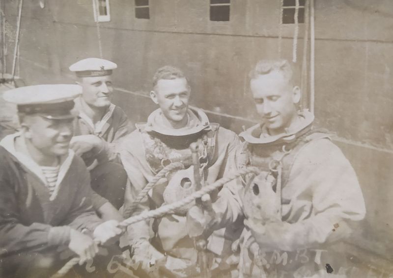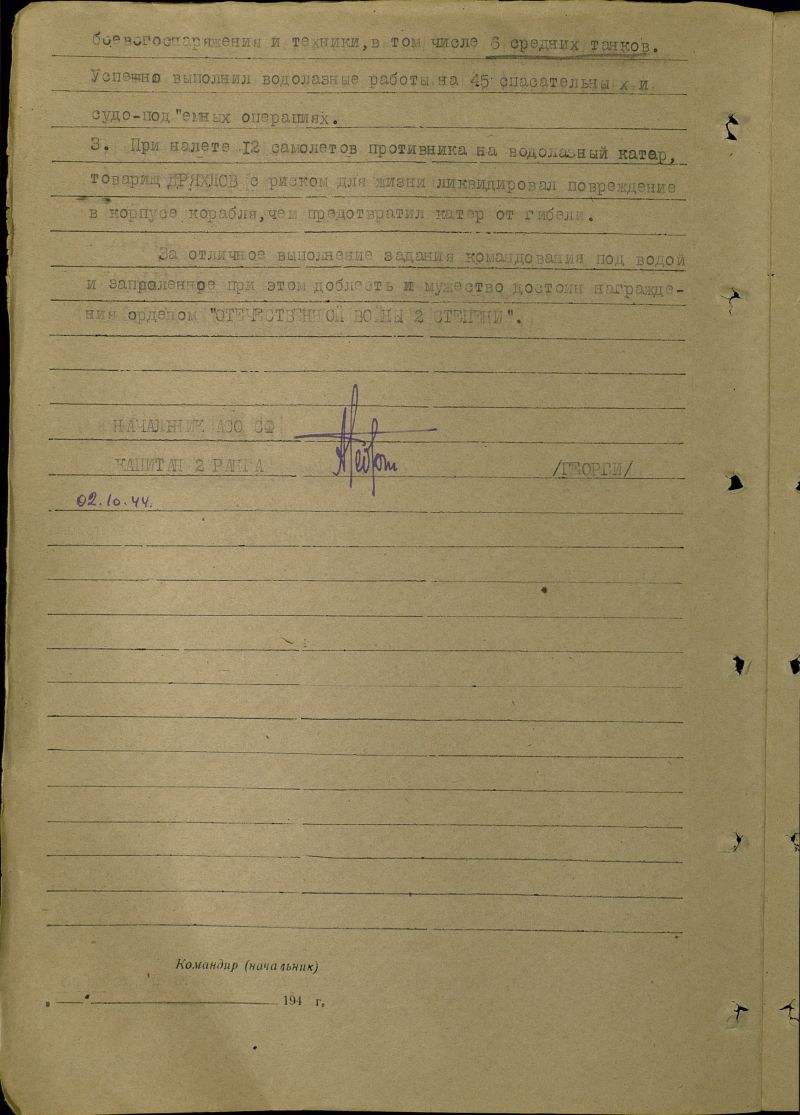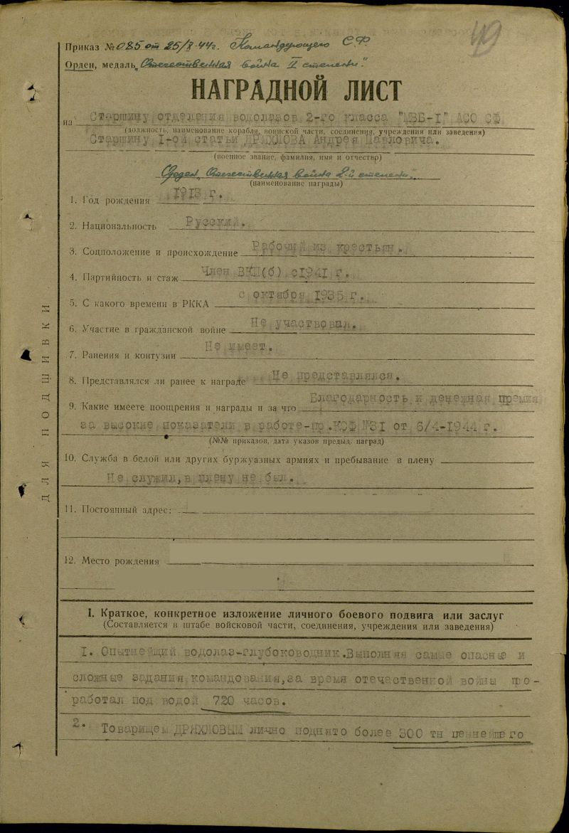 Мичман. Старшина отделения водолазов 2-го класса МВБ-I АС СФ Андрей Павлович Дряхлов. Призван в 1935 году в ЭПРОН, с 22 июня 1941 года в аварийно-спасательной службе Северного флота. Корабль «Вайгач». К октябрю 1944 года проработал под водой 720 часов, лично поднял свыше 300 тонн ценнейшего груза (так в приказе о награждении), в том числе 5 средних танков. Участвовал в 45 спасательных и судоподъёмных операциях. При налёте авиации противника, с риском для жизни ликвидировал пробоину в корпусе водолазного катера, чем спас его от гибели. Награжден орденом Отечественной войны II степени. Член ВКП(б) с 1941 года.