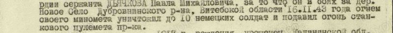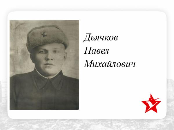 Дьячков Павел Михайлович - родной брат моей бабушки, родился в 1917г. в деревне Сельцы, Бреховский сельсовет, Калининская обл., Кимрский р-н. Призван в РККА в 1941г. Кимрским РВК, Калининская обл. Место службы: 46-ая Гвардейская стрелковая дивизия 135-ом стрелковом полку. Сержант. Погиб , 5 июля 1944г. Похоронен в братской могиле: г. Видзы, Браславского района, Витебской области, Белоруссия.(Книга Памяти Кимрского района).