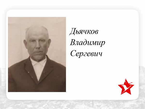 Дьячков Владимир Сергеевич родился в 1906 году в с. Терехово Шиловского района Рязанской области. В 1930 году служил в армии в составе младшего начсостава 9-ого отдельного стрелкового батальона. За участие в боевых действия Великой Отечественной войны награжден Орденом Отечественной Войны II степени (номер документа : 74, дата документа: 06.04.1985, автор документа: Министр обороны СССР). После войны работал в колхозе бондарем, занимался пчеловодством.