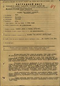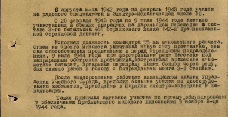 Исполнял должность командира 55 мм минометного расчета. Огнем из своего минамета уничтожал живую силу противника, тем самым способствовал продвижению вперед стрелковым подразделениям. 9 июля 1944 г. при форсировании реки Вассиоки (Вуокси) под непрерывным обстрелом противника, обстреливал вражесткие минометные батареи, прикрывая переправу наших бойцов через реку. Был тяжело ранен в голову.
