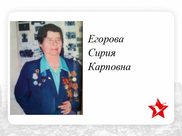 Егорова Сирия Карповна, награждена медалями” За боевые заслуги”, ”За взятие Будапешта”, ”За взятие Берлина” и многочисленными памятными медалями к каждому дню Победы. У неё 13 благодарностей от Верховного Главнокомандующего И.В. Сталина.