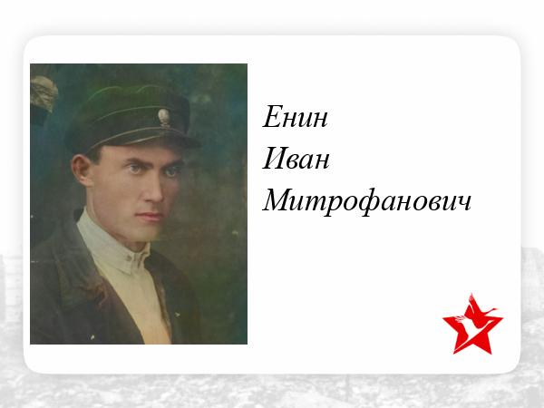 В самом начале войны Енин Иван Митрофанович, как и многие воронежцы, записался в добровольцы. После воинской подготовки ему было присвоено звание «красноармеец», должность «минометчик». Его война продлилась 6 месяцев. Прадед погиб в бою защищая село Липовское Курской области.
