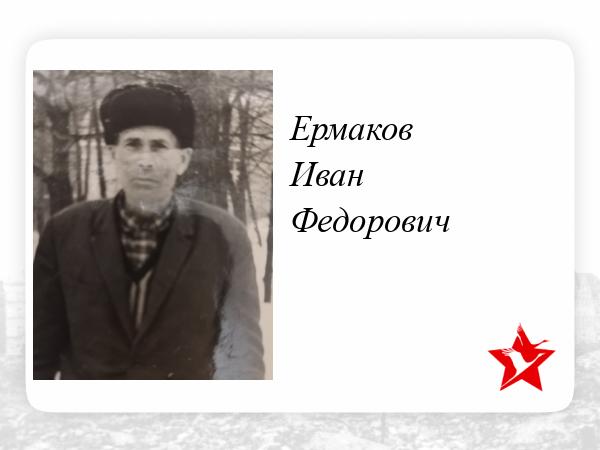 Ермаков Иван Федорович был призван Ширингушским РВК Мордовской АССР в ноябре 1941г. Служил механиком водителем танка в воинском звании сержанта в 3-ем танковом батальене 93 Отдельной Житомерской Краснознаменной орденов Суворова, Кутузова и Богдана Хмельницкого бригады. В августе 1942г. был тяжело ранен, но после выздоровления продолжил воевать. На своем танке Т-34 дедушка дошёл до Берлина. За успешное выполнение боевых заданий, проявленное при этом доблесть и мужество, он был награжден Орденом Отечественной войны II степени, Орденом Славы III степени.