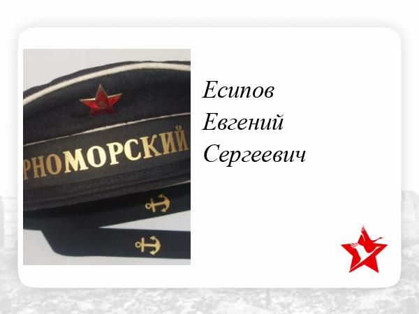 Есипов Евгений Сергеевич-старшина 1 статьи Охраны Водного района КАМОР ЧФ. Дата окончания службы: 01.01.1950. Картотека моряков ID 90006714196 Добавить в избранное Фамилия Есипов Имя Евгений Отчество Сергеевич Дата рождения/Возраст 01.04.1927 Место рождения Куйбышевская обл., Борский р-н, с. Коноваловка Дата и место призыва 19.10.1944 Борский РВК, Куйбышевская обл., Борский р-н Место службы Школа оружия ЧФ; ОВР КАМОР Воинское звание старшина 1 статьи Дата выбытия 28.04.1951 Название источника донесения Филиал ЦАМО. Архив Военно-Морского Флота. Хранилище 3 Номер шкафа 213 Номер ящика 19 Документ находится в Филиал ЦАМО. Архив Военно-Морского Флота. Хранилище 3. Шкаф:213 Ящик:19