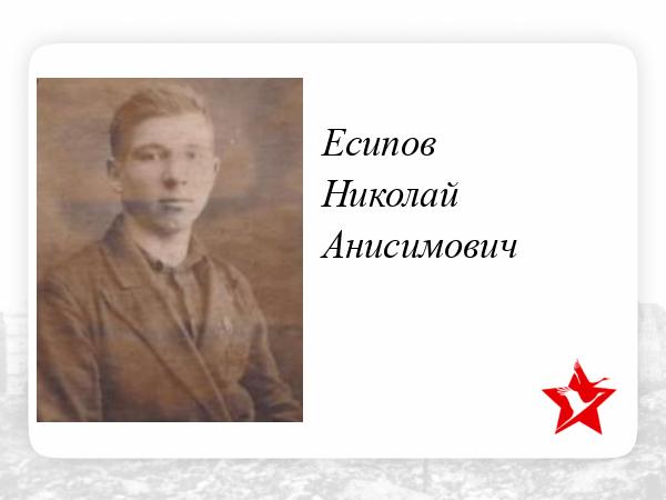 Есипов Николай Анисимович-гв. сержант 412-го Отдельного Противотанкового дивизиона 57-й Гв.СД погиб при освобождении с. Ясный Проминь 04.01.43г Ворошиловградской обл.Похоронен в с. Великоцк ВМЦ ЗУ380-13-604.Этот фронтовик-мой односельчанин.Вместе с ним из нашего села воевали-Вдовин Иван Филиппович пулеметчик 557-го СП погиб на Украине Изюмский р-н. Курнаев Кузьма Терентьевич-кр-ц 172-го Гв.СП погиб в 02.45г в Германии.Раскин Иван Ермолаевич-сержант 128-го артполка погиб на украине в Изюмском р-не в 07.43г. Раскин Петр Яковлевич 561-й Гв.СПпогиб 16.12.43г в Воронежской обл. Родомакин Николай Федорович-погиб 05.02.43г на Украине.