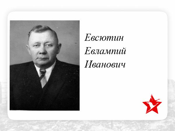 Евсютин Евлампий Иванович (10.10.1913-31.01.1991 г.г.) родился в дер.Устарь Брянской области. На фронте с августа 1941 года. Войну закончил в Австрии. Был ранен в голову в сентябре 1942 года под Сталинградом. Гвардии ст.сержант, радист Батареи управления 9 артиллерийской Запорожской Краснознаменной ордена Суворова 2-й стрелковой дивизии прорыва РГК. Награжден орденами: Красной Звезды, Отечественной войны II степени, медалями: «За отвагу», «За оборону Сталинграда», юбилейными наградами.