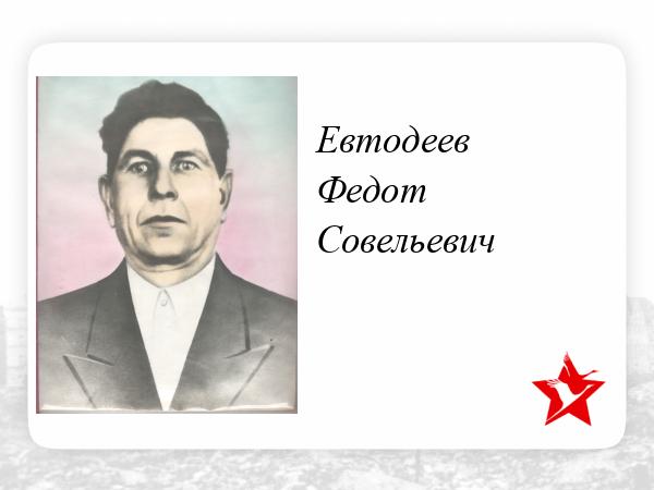 Мой прадедушка Евтодеев Федот Совельевич участник двух воин в гражданской и великой отечественной.Прадедушка родился 15.03.1898г. В ряды советской армии был призван в 1941 году.он служил водителем ,подвозил снаряды на передовую,не однократно попадал под обстрел авиации и наземных орудий,дважды был ранен осколком авиациооной бомбы и контужен .После лечения в госпитале снова пошёл на фронт.Участвовал во многих битвах,одна из них это Ржевская битва в 1942 году Прошел всю войну и вернулся домой.Скончался в ноябре 1977 года,ему было 79 лет.Моя семья и я очень гордимся моим прадедушкой.