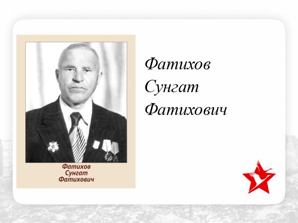 Фатихов Сунгат Фатихович родился в 1926 году в деревне Верхний Куюк Арского район Тат.АССР. Когда началась Великая Отественная Война Фатихову Сунгату Фатиховичу было 15 лет. В период одной из последний мобилизаций, его зачислили в ряды Красной армии. Он выдержал все тяготы и невзгоды военного времени. В 1943 году получил серьезное ранение ноги и был демобилизирован. Фатихов Сунгат Фатихович был награжден орденом Отечественной войны II степени и медалями за отвагу.