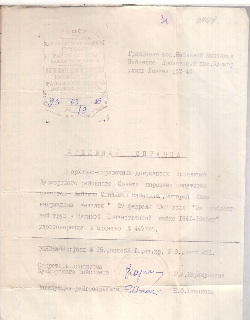 Моя бабушка Файзрахманова Минзямал Набиевна родилась 20 марта 1928 года в деревне Асан-Елга Кукморского района. Образование: 4 класса начальной школы. Проживала с семьей по адресу: Татарская АССР, рабочий посёлок Кукмор, ул. Коммунальная, дом 22