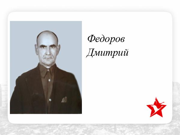 Дмитрий Антонович Федоров родился в 1923 году в селе Мосоловка Ржаксинского района Тамбовской области. Прошел славный боевой путь с первых и до последних дней войны. В 1943 году получил тяжелое ранение в ногу, лечение проходил в эвакуационном госпитале № 2796 в Горьком. Впоследствии получил инвалидность третьей группы.