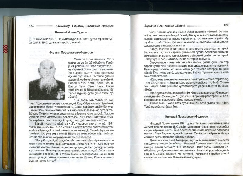 Федоров Филипп Прокопьевич родился 26 августа в 1916 в деревне Старое-Ахпердино Батыревского района. В 1938 году был призван на службу в советскую армию. Сначала служил на Капском полуострове, потом его перебросили в Финляндию. В 1939 году началась учеба в полковой школе в г.Пушкино, стал младшим командиром. До начала войны там же продолжил службу в десантных войсках и стал парашютистом. Воевал за осовбождение Москвы, за Ленинград. В сражениях за город-герой Филиппа Прокопьевича ранило и его отправили лечиться в Архангельский госпиталь. После 4 месяцев лечения молодой солдат опять в строю. Но в очередном бою его опять ранит и его отправляют лечиться в г.Красноуральск.Ему было сделано 2 операции. Но все же не сдавался боец. Но раны дали о себе знать и в 1943 году бравый солдат возвращается на родину в деревню Старое-Ахпердино Батыревского района ЧР. Стал работать в родном колхозе, заведующим на ферме. Приложил много сил, чтобы возродить свой родной колхоз. После войны ему дали инвалидность 2 группы. Вместе с женой вырастили 8 детей. В 2010 ветерана ВОВ не стало, но память о нем всегда останется в сердцах его детей, внуков и правнуков.