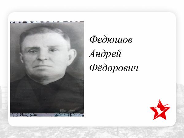 Федюшов Андрей Фёдорович начал свой военный путь в 1939 году, участвовал в Финской войне,потом в войне с Германией. Призван был из села Любятино Пензенской области, район много раз переименовывался - был Кучкинский, Нечаевский. Военкомат может быть Терновский. Служил в авиации дальнего действия. Строил и обслуживал взлётно-посадочные полосы. Был награждён, к сожалению, медали не сохранились.С фронта вернулся в 1945 году.