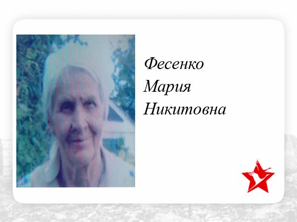 Своего прадедушку Фесенко Григория я не застал в живых. Моя прабабушка Фесенко Мария Никитовна родилась в 1932 году. У нее было 2 брата и сестра. В 1941 году, когда началась война, ей было всего лишь 9,5 лет. Хоть она была и маленькая, но навсегда запомнила те трагические годы. Им очень тяжело жилось. Все мужское население ушло на фронт. На полях работали старики и женщины. Люди голодали и недосыпали. Рядом взрывались снаряды. Немцы сжигали целые деревни. Нечего было одеть. Обувь была одна на несколько человек. Сегодня дети войны – это особое поколение украинцев, свидетелей тех трагических событий Великой отечественной. Сейчас это уже пожилые люди, но свое военное детство они не забудут никогда. Сейчас прабабушка Мария уже старенькая, ей 80 лет. Но она не сидит без дела, летом едет в село и занимается огородом. Она пережившая войну, знает цену куска хлеба. Я горжусь ею и очень люблю, желаю ей крепкого здоровья. После ее рассказа я понял, что главная мечта всех людей – только б не было войны.