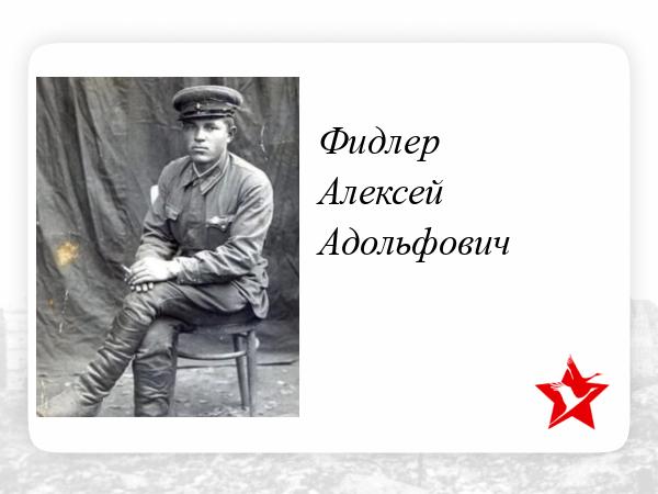 Фидлер Алексей Адольфович родился 18 августа 1917 года. Участник финской войны. Позже был участником Великой Отечественной войны. Участвовал в обороне Москвы, получил сильную контузию. Попал в госпиталь, после выздоровления был отправлен в трудармию так как был осуждён по национальному вопросу (немец). Демобилизован из трудармии летом 1946 года.