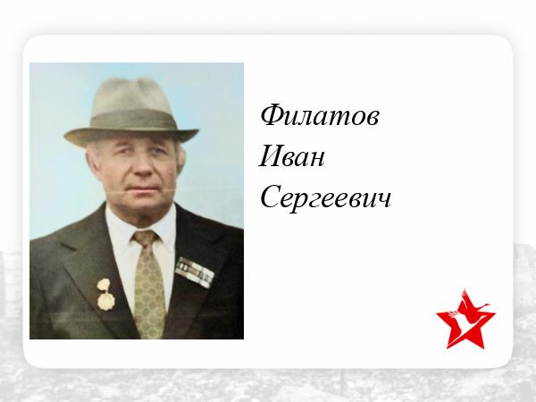 Мой дедушка Филатов Иван Сергеевич был призван на фронт в августе 1942 года, на тот момент ему было 17 лет. Определили дедушку в состав 1176 зенитно-орудийного артиллерийского полка (37 мм орудия). Полк в составе других армий был направлен на Ленинградский фронт. Так дедушка в декабре 1942 попал в осажденный Ленинград. Он провел всю войну в составе 115 зенитного артиллерийского полка, позже 43й артиллерийской бригаде ПВО, защищая город и даже после победы в мае 1945 года он остался восстанавливать город и вернулся в родное село значительно позже. Награжден медалями "За оборону Ленинграда" и "За победу на Германией". После возвращения дедушка женился на моей бабушке Филатовой Марии Федоровне, которая тоже прожила свою войну, но по другую сторону фронта – она труженица тыла. Прожили они вместе 61 год и родили четырех замечательных дочек. Дедушка мало что рассказывал про войну дочкам/внукам, практически не рассказывал об ужасах блокады и о том, что ему пришло пережить. Он всегда с особым трепетом встречал праздник 9 мая, ходил на встречи с сослуживцами и другими ветеранами, с гордостью читал поздравительные телеграммы от президента, после переезда в город, родные всегда старались отвести его на Парад. Дедушка прожил достойную жизнь, много работал, никогда не унывал, искрометно шутил, он всегда был для нас примером и опорой. Мы его помним и любим.
