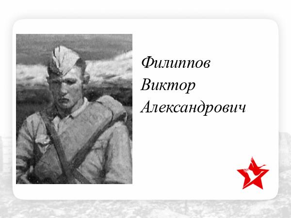 Филиппов Виктор Александрович (1919 г.р.) был призван в ряды РККА Кировским РВК Днепропетровска в декабре 1939 года, направлен в город Балаклея Харьковской области, род войск - пехота. До мобилизации работал на заводе “Союзстроймеханизация” в Днепропетровске учеником токаря. Связь с родными прекратилась в июле 1941 года, пропал без вести. В первые месяцы войны немецкие войска организовали несколько «котлов» на территории Украины и в Белоруссии. В окружение попали 17 советских армий, 13 мехкорпусов, около 1,5 млн. человек погибли, пропали без вести или попали в плен. Гитлеровцы захватили большую часть тяжелого вооружения и техники, оккупировали огромные территории. При таком катастрофическом поражении любая другая страна капитулировала бы, но Советский Союз выстоял благодаря мужеству и стойкости советских солдат и офицеров, большим территориальным и человеческим ресурсам, созданию мощных мобилизационных резервов и передислокации основных производственных мощностей в глубь страны. Несмотря на все промахи командования и неудачи первых месяцев войны, страна почти четыре года собирала силы для решительного броска на Берлин и одержала Победу, базу которой заложили своей стойкостью и мужеством советские бойцы и офицеры, сложившие свои головы в «котлах» 41-го — на самом тяжелом этапе войны. Филиппов Виктор Александрович - уроженец г.Новохоперска Воронежской области.