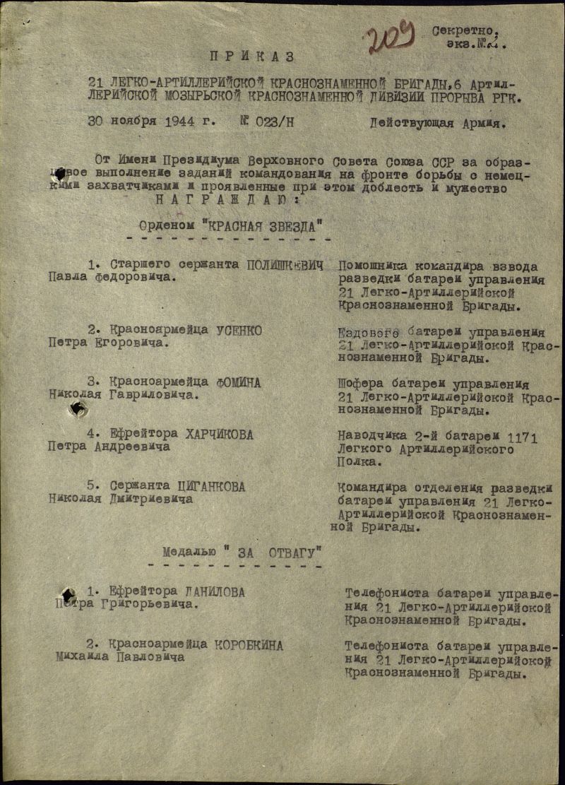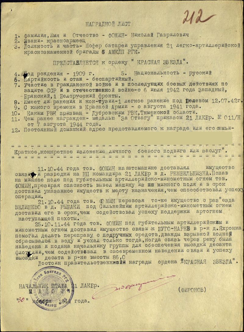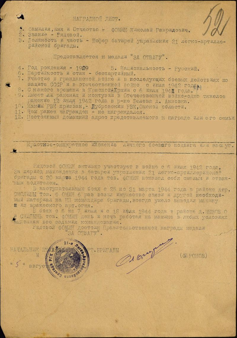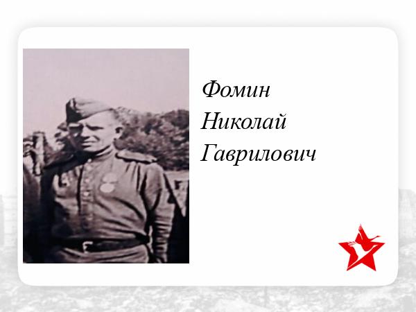 Рядовой Фомин Николай Гаврилович активно участвовал в войне с 06 июля 1941 г., за период нахождения в батареи управления 21 Легко-Артиллерийской Краснознаменной бригады с 20 марта 1944 года наш прадедушка показал себя смелым и отважным водителем.