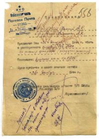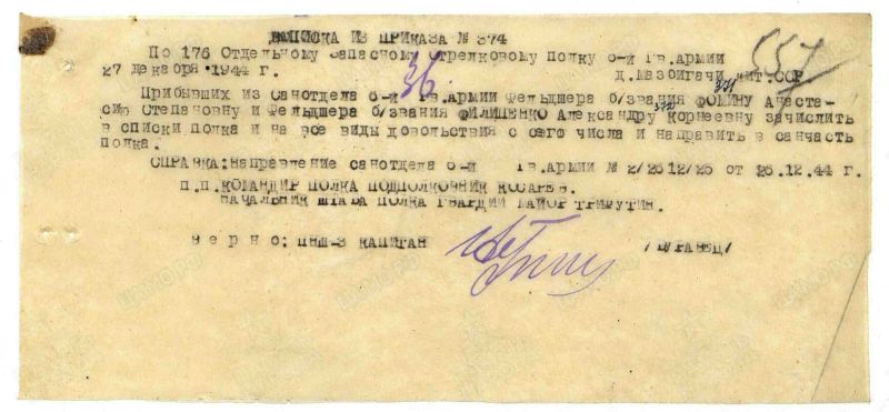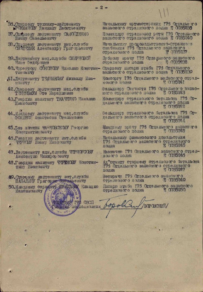 Издан: ГЛР 4176 под №С01837, Медаль «За победу над Германией в Великой Отечественной войне 1941–1945 гг.» №: 495 От: 20.10.1945 176 озсп под №Е0035244. Дата окончания службы: 19.12.1945