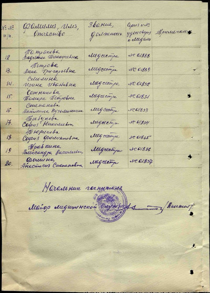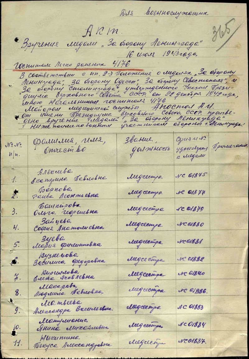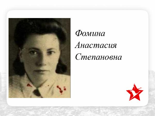 Фомина Анастасия Степановна-лейтенант медицинской службы госпиталя легко раненных №4176, который находился в г. Ленинграде. Продолжила службу в 176-м Отдельном Запасном полку 6-й Гвардейской Армии. Награждена медалями “За Оборону Ленинграда” От: 16.07.1943