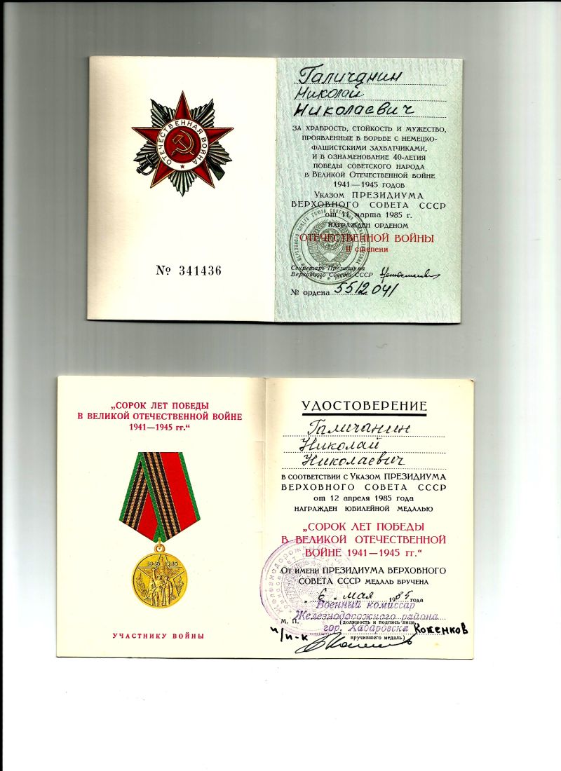 Галичанин Николай Николаевич - участник боев на Халхин-Голе, в войне с милитаристкой японией. Служил в звании майора морской пехоты. Награжден орденами и медалями : Орден ОТЕЧЕСТВЕННОЙ ВОЙНЫ 2-ой СТЕПЕНИ, медали «ЗА ПОБЕДУ НАД ГЕРМАНИЕЙ В ВЕЛИКОЙ ОТЕЧЕСТВЕННОЙ ВОЙНЕ 1941 – 1945 гг.», «ЗА ПОБЕДУ НАД ЯПОНИЕЙ», «ЗА БОЕВЫЕ ЗАСЛУГИ», «ЗА ДОБЛЕСТЬ И ОТВАГУ В ВЕЛИКОЙ ОТЕЧЕСТВЕННОЙ ВОЙНЕ», «ДВАДЦАТЬ ЛЕТ ПОБЕДЫ В ВЕЛИКОЙ ОТЕЧЕСТВЕННОЙ ВОЙНЕ 1941 – 1945 гг.», «ТРИДЦАТЬ ЛЕТ ПОБЕДЫ В ВЕЛИКОЙ ОТЕЧЕСТВЕННОЙ ВОЙНЕ 1941 – 1945 гг.», «СОРОК ЛЕТ ПОБЕДЫ В ВЕЛИКОЙ ОТЕЧЕСТВЕННОЙ ВОЙНЕ 1941 – 1945 гг.».