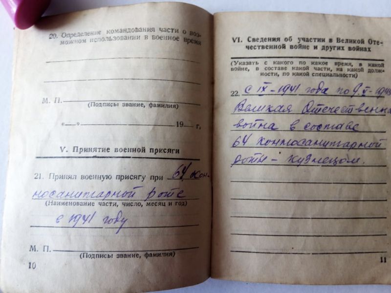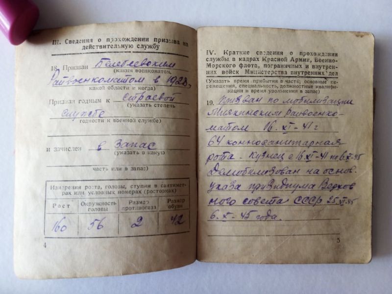 Отслужил в армии в 1928 году, затем мобилизован в 16 ноября 1941 года в 64 конно-санитарную роту кузнецом.