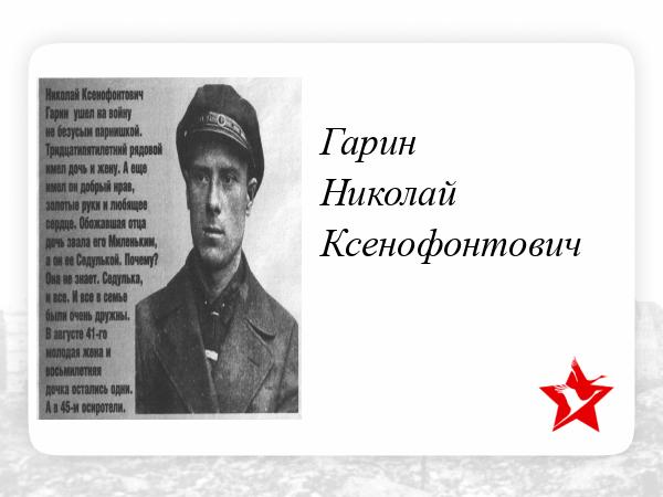 Николай Ксенофонтович Гарин был призван в Красную Армию 11 августа 1941 года. Воевал наводчиком станкового пулемёта в составе стрелковой роты 642 полка, 200 стрелковой Двинской дивизии, 3 Ударной армии, 2 Прибалтийского фронта. 17 февраля 1945 года был тяжело ранен в бою с немецкими фашистами. 20 февраля 1945 года умер от ран в госпитале. Награждён орденами “Отечественной войны 1 степени”, “Славы 2 степени”, “Славы 3 степени” и медалью “За Отвагу”. Во время выполнения боевых заданий на фронте был четырежды ранен. Похоронен на кладбище города Тухоля в Польше.