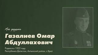 В неравном бою с немецкими захватчиками его самолет был сбит ЯК-2 и он с несовместимыми с жизнью ранениями был переведен в полевой госпиталь. После, по состоянию здоровья, 3 ноября 1945 года он был отправлен на Родину. С тяжелыми ранениями он вернулся домой. После войны мой дедушка работал председателем исполкома с.Агул и первым секретарем партийного Дербентского окружкома. Также он стал редактором Ахтынского радиовещания, начальником аэропорта и в последние же годы инструктором партийного райкома. Он с честью и достоинством выполнил долг перед родиной и народом. Приказами главнокомандующего Маршала Советского Союза товарища Сталина ему объявлены благодарности: «Приказ от 2 февраля 1943 года «За участие в боях по успешному завершению ликвидации окруженных под Сталинградом вражеских войск»»; «Приказ от 13 апреля 1944 года «За участие в боях по овладению городом и портом Феодосия – важным опорным пунктом противника на Юго-Восточном побережье Крыма»». Был награжден медалями: «За трудовое отличие», «За отвагу», «За трудовую доблесть», «За боевые заслуги», «За оборону Сталинграда», «За доблестный труд в Великой Отечественной войне 1941-1945гг.», «За победу над Германией в Великой Отечественной войне 1941-1945гг.», а также орденами: «Победа», «Знак почета» и «Орден Отечественной войны». Дедушка скончался 23 января 1973 года. Я горжусь, что мой дедушка Газалиев Омар Абдуллахович с честью и достоинством, геройски сражался. Они одержали великую победу и заслуживают оказании чести и достоинства за мирное небо и свободу своим потомкам.