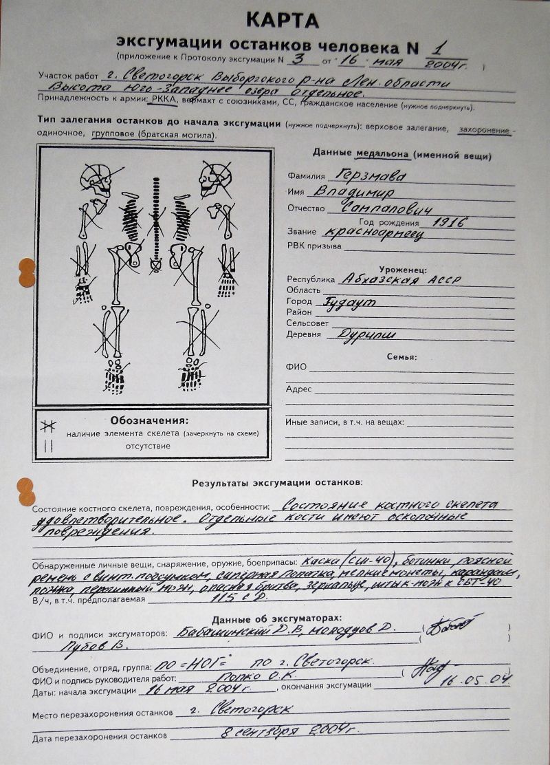 Красноармеец, миномётчик Герзмава Владимир Сампапович 1916 г.р. Уроженец: Абхазская АССР, Гудаутский р-н. г. Гудаута. Числится в списках 1 стрелковой роты, 576 стрелкового полка, 115 стрелковой дивизии. Считался пропавшим без вести с августа 1941 года. Погиб в бою 06.08.1941г. Найден в 2004 году, опознан по солдатскому медальону. Похоронен на воинском мемориале №59 в г. Светогорск, Ленинградской обл.