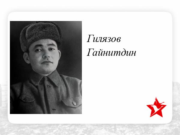 Гилязов Гайнитдин, проживал вместе со своей семьей в селе Сыростан Челябинской области. Он был очень добрым, отзывчивым, трудолюбивым, хорошим семьянином. Работал в колхозе конюхом. В 1941 году был призван добровольцем на защиту Родины от фашистских захватчиков. Участвуя в защите Сталинграда, проявив геройство и мужество был ранен и умер от ран 24 октября 1942 года. Похоронен в братской могиле №7, ферма №3 Городищенского района Сталинградской области. Перезахоронен в братской могиле в п.Кузьмичи Волгоградской области. Награжден посмертно Памятной медалью «60 лет Сталинградской битвы».