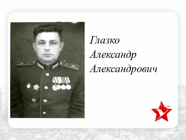 Когда началась война мой дед, Глазко Александр Александрович, заканчивал Харьковский педагогический институт, оставалось только защитить диплом. Вместе со своими однокурсниками хотел идти сразу на фронт, но мать, Ефросинья Ивановна, уговорила его все же получить диплом. Этим она спасла деду жизнь, потому что эшелон, которым его однокурсники следовали на фронт разбомбили, и все они там погибли. Сразу после института он поступил в Артиллерийское училище, прошел ускоренный курс. Был участником 1 Белорусского и Центрального фронтов. Был сначала начальником штаба, а после командиром дивизиона 56 Гвардейского Минометного Краснознаменного ордена Суворова полка. Участвовал в обороне Сталинграда, их подразделение стояло на станции Разгуляевка. За годы войны был трижды ранен, до конца жизни у него были осколки в коленях и в сердечной сумке.