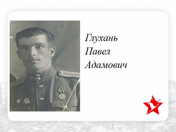 Дедушка родился 29 декабря 1924 года в селе Виноградовка Москаленского района Омской области. Закончил школу в селе Евграфовка. Затем проходил обучение в ФЗО по специальности связист (азбука Морзе). В 1942 был призван на военную службу. Уже в послевоенное время дедушка получил высшее образование в Омском педагогическом институте по специальности географические науки. Дедушка работал в районном комитете на должности 2-го секретаря. В 1982 году семья Глухань переехала в Омск в связи с переводом по работе. В 1984 году дедушка пошёл на пенсию и стал заниматься воспитанием внуков. Именно он учил нас всех читать, считать, играть в шахматы, домино и всячески развивал наш детский любопытный кругозор. И всегда находил ответы на любые наши вопросы. Единственная тема, о которой он не любил говорить, - это война. Неудивительно, все ,кто пережил такое, не могут вспоминать без слез. Из рассказов бабушки я знаю, что дедушка все военные действия, в которых он участвовал, был командиром танка, и однажды снаряд упал совсем близко, попав в соседний танк, где находился лучший друг дедушки. На войне гибли тысячи, и это очень большая утрата для всех , но ещё больней потерять родного человека. Именно поэтому он не любил вспоминать те страшные события. Дедушка был очень хорошим человеком, он всегда всем стремился помочь, но в то же время был очень спокойным и скромным, не побоюсь этого слова, он был действительно святым человеком, идеалом человека для всей своей семьи. К сожалению из-за болезни его уже нет с нами, 60-я годовщина со Дня Победы была юбилейной и последней для него. Дедушка умер 7 января 2006 года. Но он всегда живет в наших сердцах.