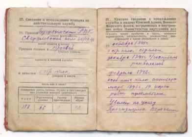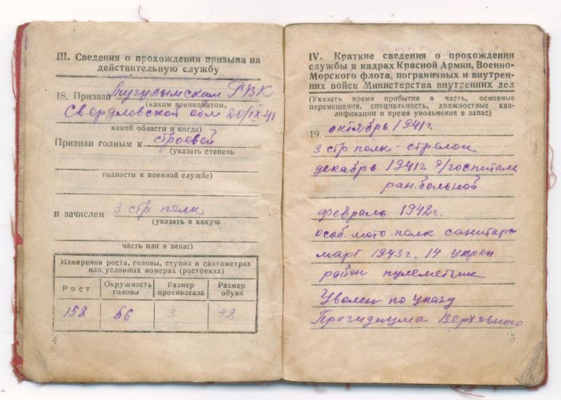 Призывался Тугулымским РВК Свердловской области 20. 09.1941 года.Принял присягу 27.05.1941 года. Воевал в 3-ем стрелковом полку 67-ой Армии Ленинградского фронта. Награжден под городом Пушкиным, приказ по армии № 0638/Н, 30 декабря 1944 Медалью за отвагу. Был ранен в голову феврале 1942 года.