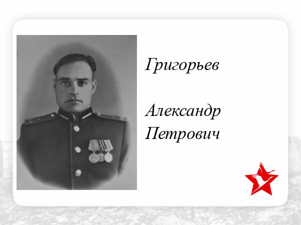 Мой отец Григорьев Александр Петрович , закончив трех месячные ускоренные курсы младшего командного состава воевал в Великой Отечественной войне в составе Южного фронта, 169 отдельного пулеметного артиллерийского батальона 78 укреп. района с 08.1942 г. по 11. 1944 г. Был тяжело ранен в бою .Награжден Орденом Великой Отечественной войны , тремя боевыми медалями - ,,За боевые Заслуги ,, , ,, За Отвагу ,, , За победу над Германией ,, .