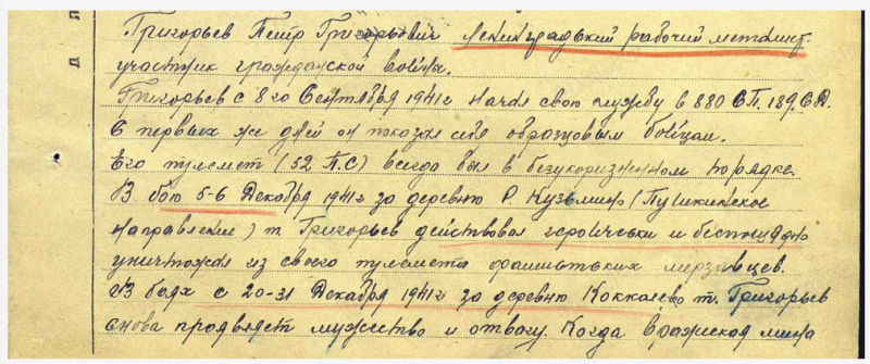 27 января 1942 года Пётр Григорьев бил по противнику из 2-х амбразур поочерёдно. И вдруг обнаружил вражеского снайпера. Он был хорошо замаскирован. Скрытно, по противотанковому рву подобрался Григорьев к снайперу и уничтожил его на месте. К вечеру перед позицией Григорьева появились ещё 4 фашиста, он свалил и их. Прибежали солдаты и хотели оттащить трупы. Григорьев уничтожил ещё троих ".