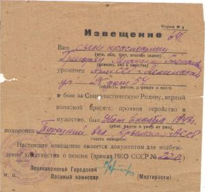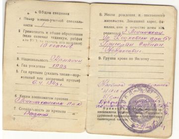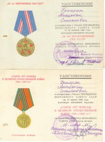 Дед супруги, Григорян Мнацакан 1923г рождения, Арм ССР г. Степанаван, после рождения Мнацакана родители переехали в г. Ленинакан , откуда и призвали 6 января 1943г на фронт.Воевал в составе Южного фронта, 4 Украинского,1 Прибалтийского. Начиная путь рядовым 1943г и дослужился до старшины роты, демобилизован 1947. Служил в разведроте, был ранен, не любил рассказывать про войну. В то время когда раненный лежал в санчасти , домой родителям доставили извещение о гибели сына( из текста извещения - Ваш сын красноармеец Григорян Мнацакан Степанович , в бою за Социалистическую Родину, верный воинской присяге , проявив геройство и мужество , был убит 6 ноября 1943г.Похоронен Турецкий Вал, Крымская АССР.). Какого же было удивление и неописуемая радость, смешанная с удивлением , когда 29 марта 1947г на пороге дома появляется живой и здоровый с медалями на груди старшина Григорян Мнацакан.