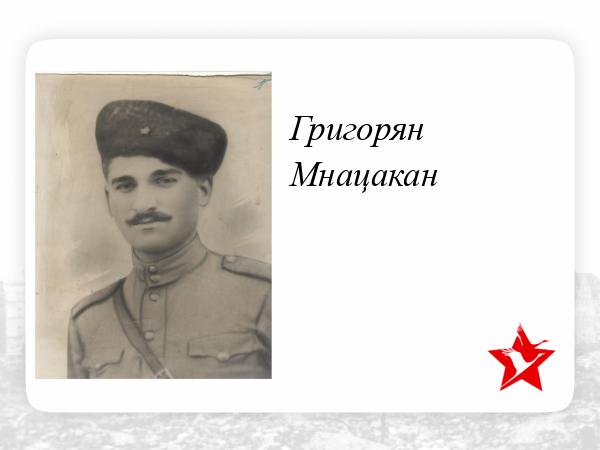 Григорян Мнацакан 1923г рождения, Арм ССР г. Степанаван, после рождения Мнацакана родители переехали в г. Ленинакан , откуда и призвали 6 января 1943г на фронт.Воевал в составе Южного фронта, 4 Украинского,1 Прибалтийского. Начиная путь рядовым 1943г и дослужился до старшины роты, демобилизован 1947. Служил в разведроте, был ранен, не любил рассказывать про войну. В то время когда раненный лежал в санчасти , домой родителям доставили извещение о гибели сына( из текста извещения - Ваш сын красноармеец Григорян Мнацакан Степанович , в бою за Социалистическую Родину, верный воинской присяге , проявив геройство и мужество , был убит 6 ноября 1943г.Похоронен Турецкий Вал, Крымская АССР.). Какого же было удивление и неописуемая радость, смешанная с удивлением , когда 29 марта 1947г на пороге дома появляется живой и здоровый с медалями на груди старшина Григорян Мнацакан.