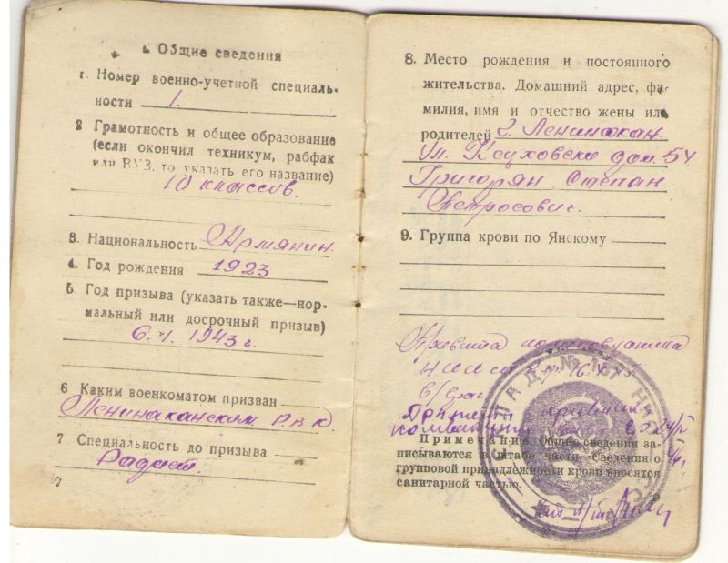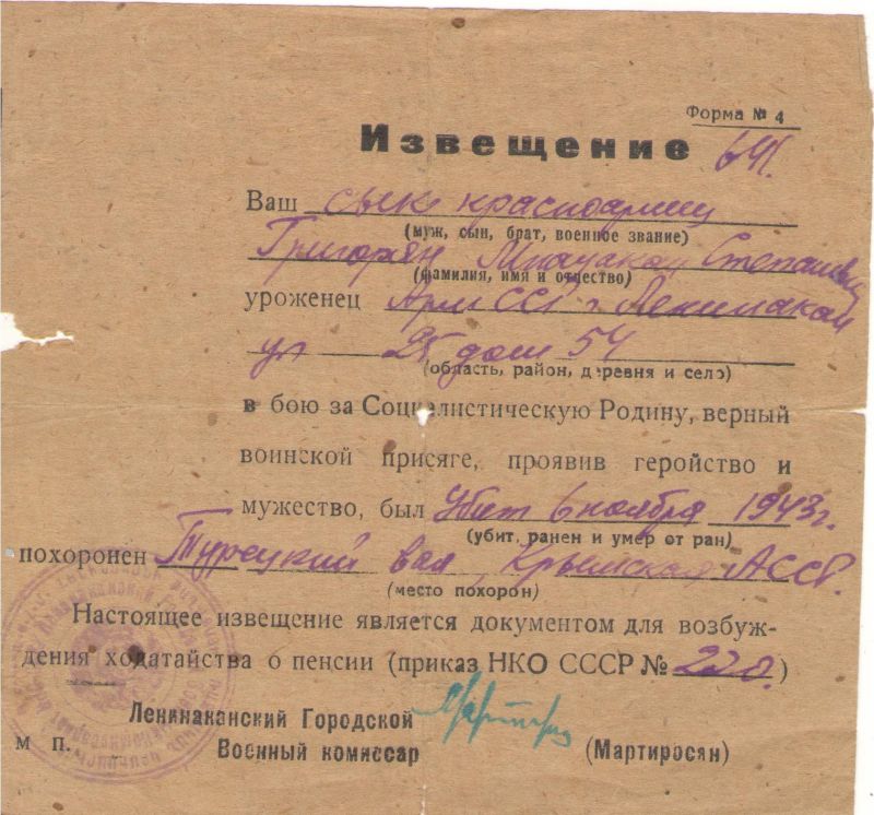 Дед , Григорян Мнацакан 1923г рождения, Арм ССР г. Степанаван, после рождения Мнацакана родители переехали в г. Ленинакан , откуда и призвали 6 января 1943г на фронт.Воевал в составе Южного фронта, 4 Украинского,1 Прибалтийского. Начиная путь рядовым 1943г и дослужился до старшины роты, демобилизован 1947. Служил в разведроте, был ранен, не любил рассказывать про войну. В то время когда раненный лежал в санчасти , домой родителям доставили извещение о гибели сына( из текста извещения - Ваш сын красноармеец Григорян Мнацакан Степанович , в бою за Социалистическую Родину, верный воинской присяге , проявив геройство и мужество , был убит 6 ноября 1943г. Похоронен Турецкий Вал, Крымская АССР.). Какого же было удивление и неописуемая радость, смешанная с удивлением , когда 29 марта 1947г на пороге дома появляется живой и здоровый с медалями на груди старшина Григорян Мнацакан.