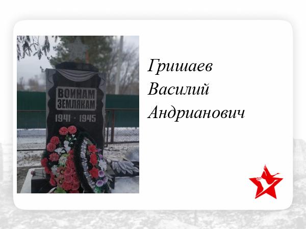 ГРИШАЕВ ВАСИЛИЙ АНДРИАНОВИЧ (в отдельных документах записано АНДРЕЕВИЧ) родился в 1920 году в с. Сабуро-Покровское, Никифоровский район, Тамбовская обл.
