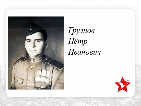 Мой двоюродный дед, Грузнов Пётр Иванович, 1909 года рождения, в Великую Отечественную войну воевал в составе 461-го стрелкового полка, 142-й стрелковой дивизии, Ленинградского фронта и 2-го Белорусского фронта.