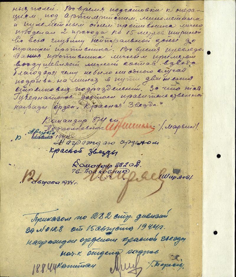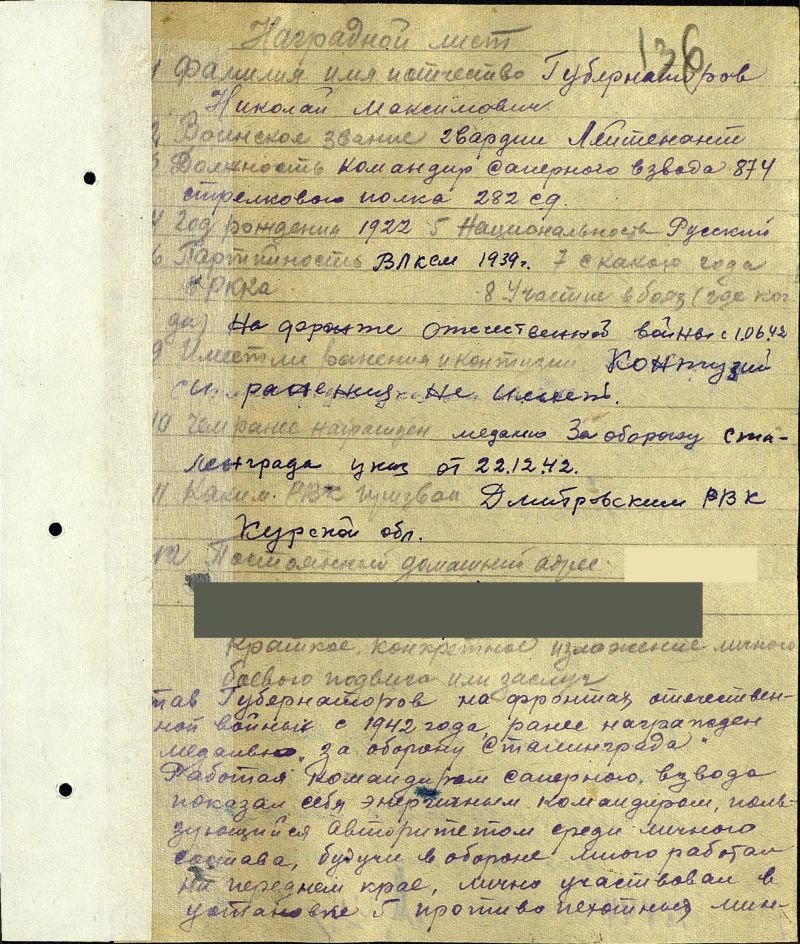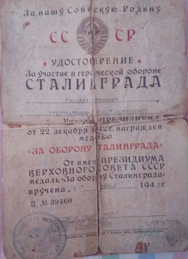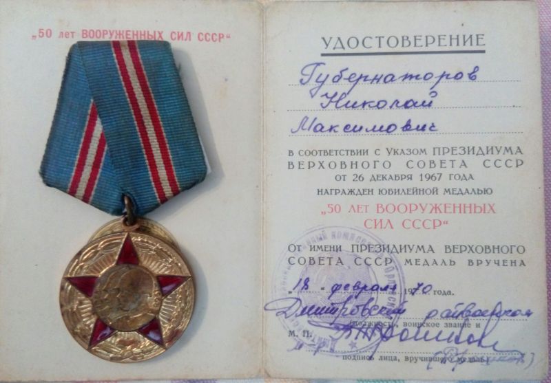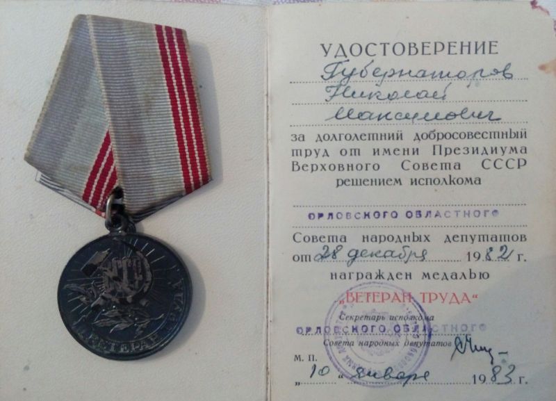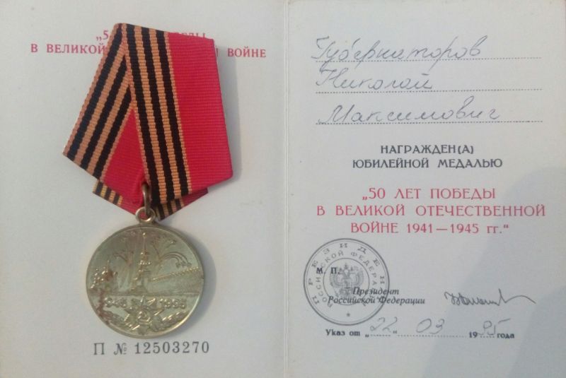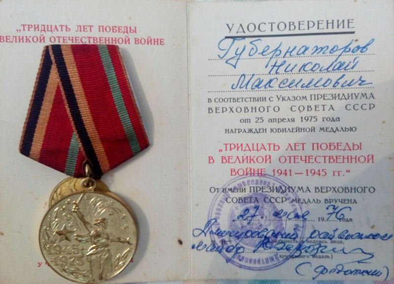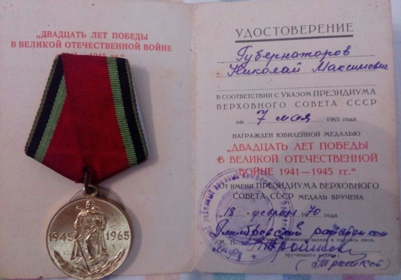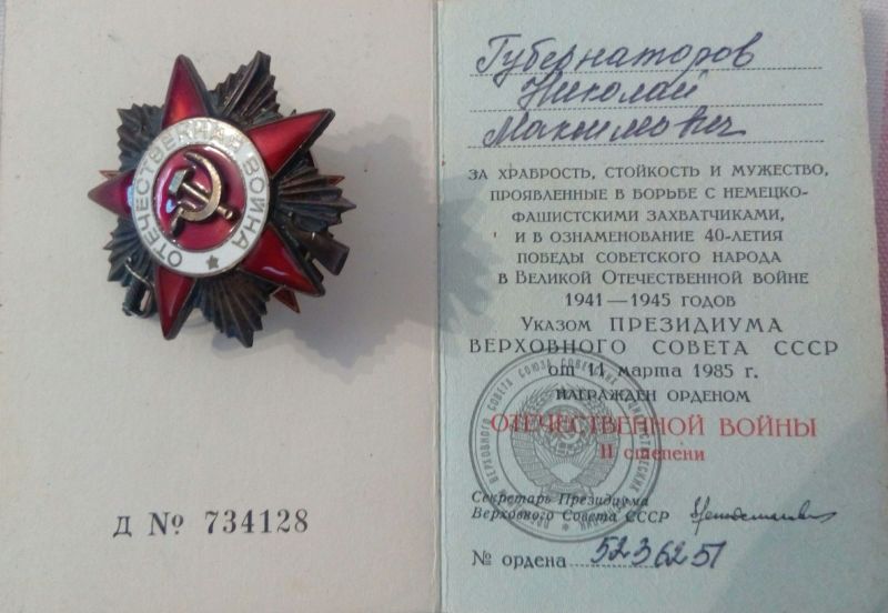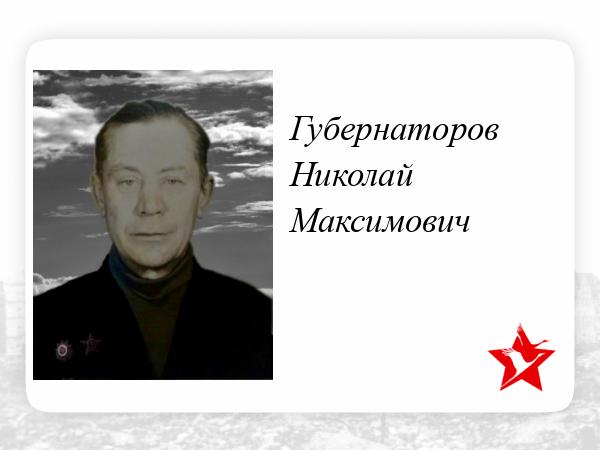 Губернаторов Николай Максимович, родился в д.Любощь, Дмитровского р-на, Орловской области 15 июня 1922года. Проходил службу в ВС СССР в период с июня 1942г. по июнь 1945г. Принимал участие во фронтах: 06.1942г. по 10.1942г. - Западный фронт в должности электромеханик, 10.1942г по 03.1943г. - Донской фронт в должности электромеханик, 05.1943г. по 03.1944г. - Западный фронт в должности электромеханик, 03.1944г. по 10.1944г - 2й Прибалтийский фронт в должности командира саперного взвода, 10.1944г. по 02.1945 - 1й Украинский фронт в должности командира саперного взвода.
