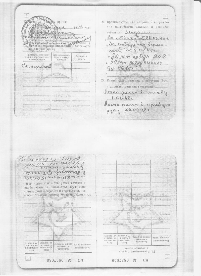 Родился 13 июля 1923 года. С октября 1941 года по сентябрь 1942 года орудийный номер в 84 арт. полку, с 09.1942 года по 02.1943 года был в госпитале после чего с 02.1943 - 03.1943 года орудийный номер в 69 запасном арт. полку, 03.1943-09.1944 г.г. имел должность телефониста в 27 арт. дивизии-батарея управ., с 09.1944-11.1945 г.г. разведчик-артилерист в 573 легко-арт.полк, с 11.1945 - 04.1947 -г.г. командир отделения разведки.