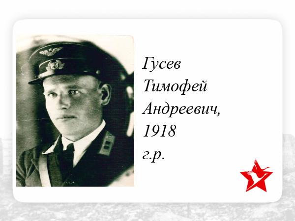 Гусев Тимофей Андреевич, родился в 1918 году в д. Бугуруслан Стерлитамакского района. Это родной брат моей бабушки. Закончил лётное училище _______ и в 1941 г. служил в армии в подмосковной эскадрильи штурманом. Оттуда же был призван на фронт. Он был одним из тех, кто в первые – не часы даже, а минуты войны - взлетали в воздух, чтобы отбить атаки немецких асов.