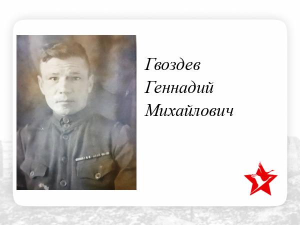 Гвоздев Геннадий Михайлович -1919г.р. Участник Финской1939-1940 и Отечественной 1941-1945 войн, имел награды, умер внезапно 01.05.1957г. в г. Серове, Свердловской обл.