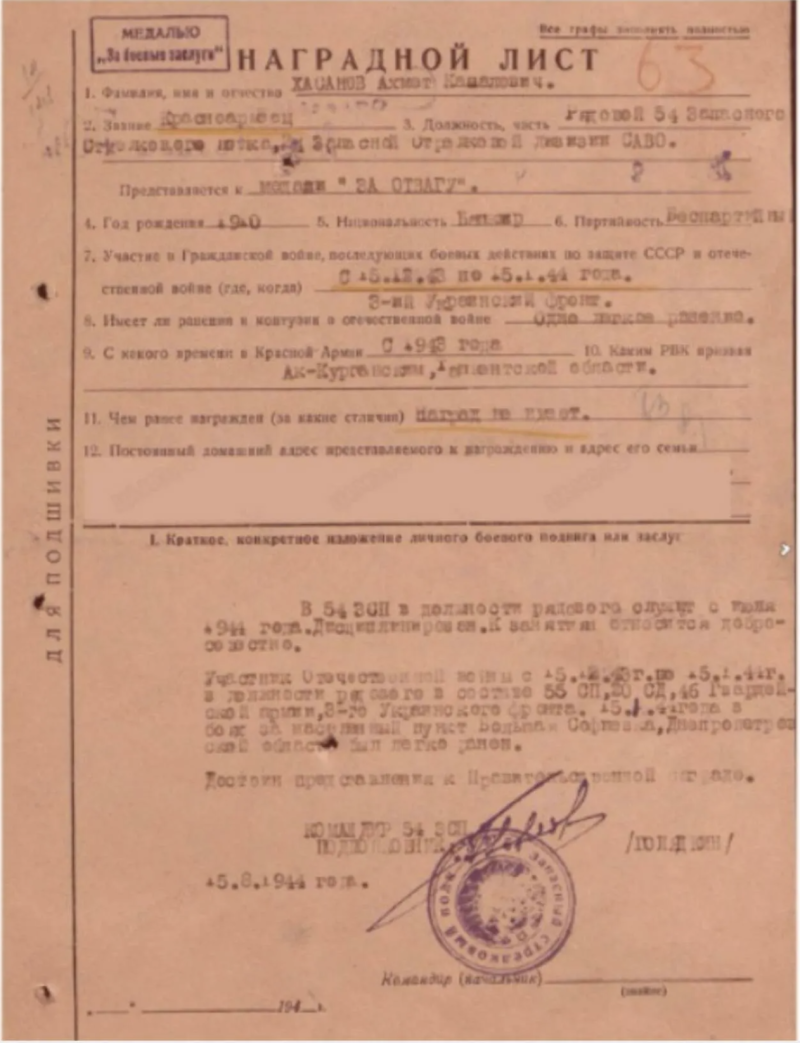 Хасанов Ахмет Камалович призван в 1943 г. Награждён медалью “За боевые заслуги”