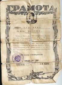 Прадедушка был награжден лично от Главнокомандующего Маршала Советского Союза товарища Сталина грамотой! Где выразил благодарность!