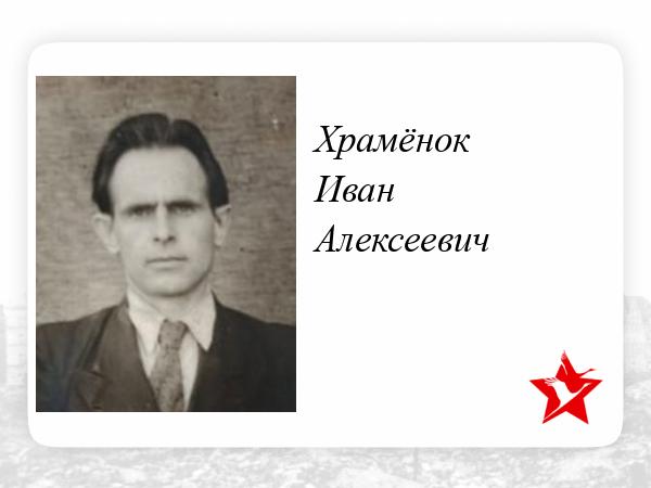 «... ИВАНА АЛЕКСЕЕВИЧА за то что является участником боев с АГОНИЦОК немецкими захватчиками сначала Отечественной войны. в бою на горо Подкова на февраля 1942 года участвовал в захвате 4-х языков" в тылу врага в районе Соколозера- в апреле 1942 года участвовал в разгроме вражеского гарнизона где убил 3-х солдат противника. ВО время боя 19 апреля 1944 года, тов. Хроменок исполняя обязанности помощника старшины своевременно доставил на поле боях боеприпасы в лично убил одного солдата противника. ...»