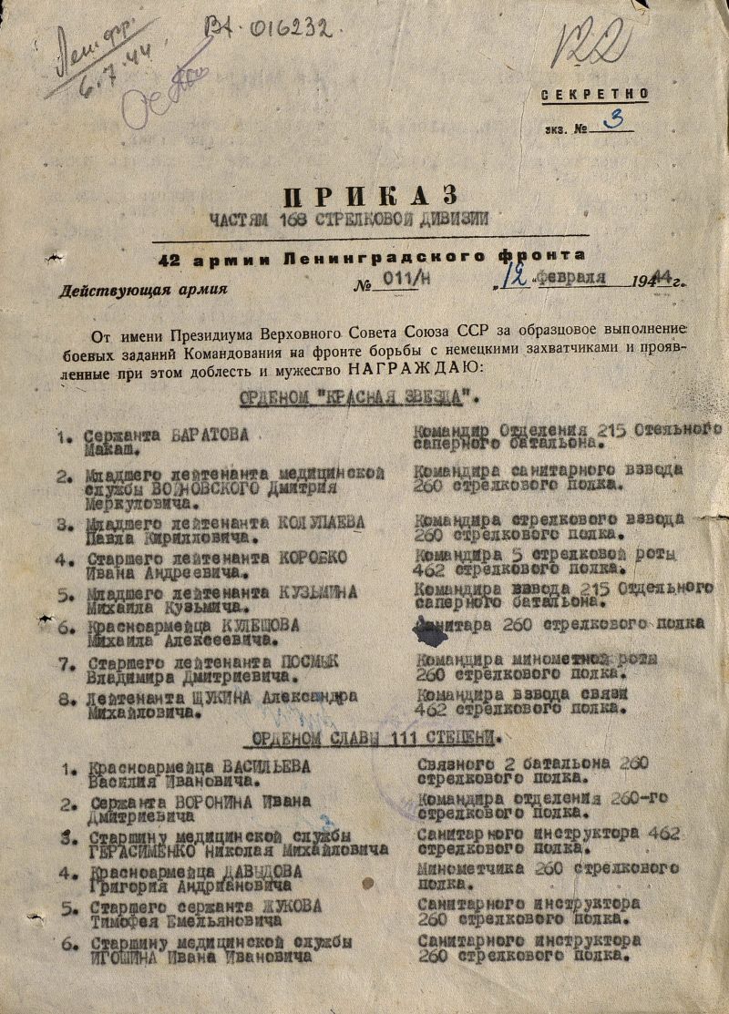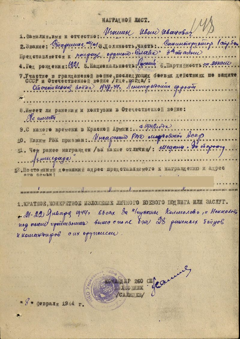 Игошин Иван Иванович, год рождения 1921 г. Место призыва: Инсарский РВК, Мордовская АССР, Инсарский р-н. Старшина медслужбы, санитарный инструктор 260 стрелкового полка. 21-22 января 1944 г. в боях за пункты Колмолово и Псколово под огнем противника вынес с поля боя 28 раненых бойцов и командиров с их оружием. Награжден Орденом славы 3 степени, медаль "За оборону Ленинграда"