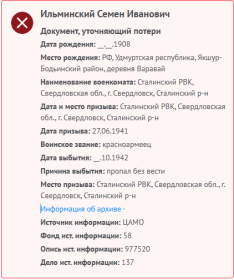 “ Ильинский Семён Иванович, 1908-01.10.1942гг. Место рождения: Удмуртская АССР,Якшур-Бодьинский район,д. Варовай. Красноармеец. В РККА с 27.06.1941г. Работал в ИТК. Пропал без вести.” стр. 12 книга"Память 2025 год г.Новоуральск" автор Ширяева Тамара Михайловна.