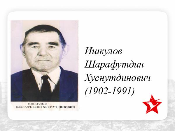 Мой прапрадед по линии матери, Ишкулов Шарафутдин Хуснутдинович, - участник Великой Отечественной войны 1941-1945 годов. За боевые заслуги награжден орденами III степени «Орден Славы», I степени «Великой Отечественной войны» и 6 медалями. Принимал участие в боевых действиях в составе 375 СП 219 стрелковой дивизии на Дону и 905 стрелкового полка под Харьковом в должности стрелка. Имел на своем счету до 10 убитых немецких солдат и офицеров.
